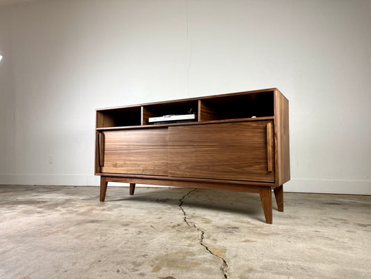 Made for the record enthusiast. Clean lines, premium materials, and smart design that fits your vinyl and audio setup seamlessly. Most of our TV consoles are designed to work just as well for yHandcrafted walnut record player consoles and mid century modern turntable cabinets built in Boise, Idaho. Designed for vinyl collectors, each piece blends sculptural form with smart storage for records and audio components. Heirloom construction. Custom sizes available.our turntable and audio equipment.